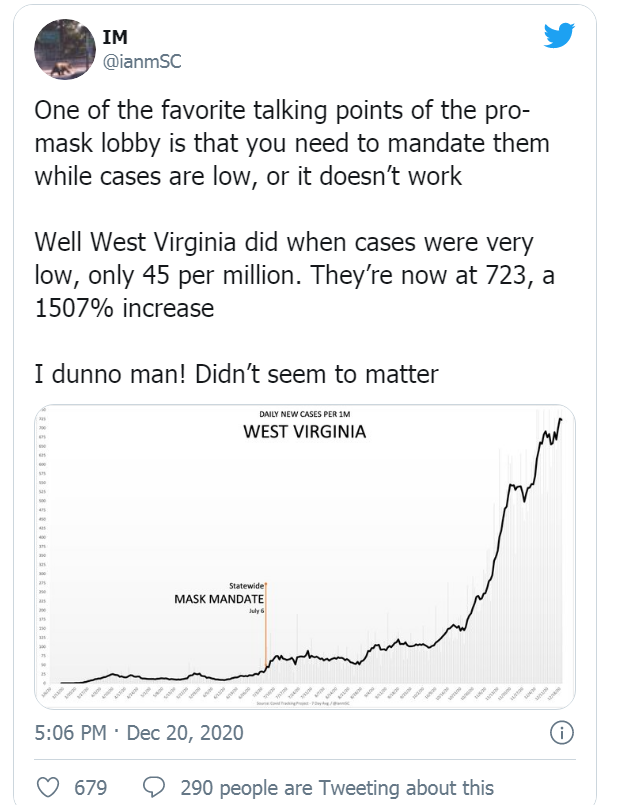 Mi primera pregunta al leer este análisis fue que tal vez hay un sesgo en los recuentos de casos en contra de aquellas áreas con mandatos de máscara porque, por definición, la mayoría de las áreas sin ellos son más conservadoras y tienden a tener una menor densidad de población. Después de todo, las áreas densas parecen estar asociadas con una mayor dispersión y, por lo tanto, esas áreas deben juzgarse con un estándar diferente.